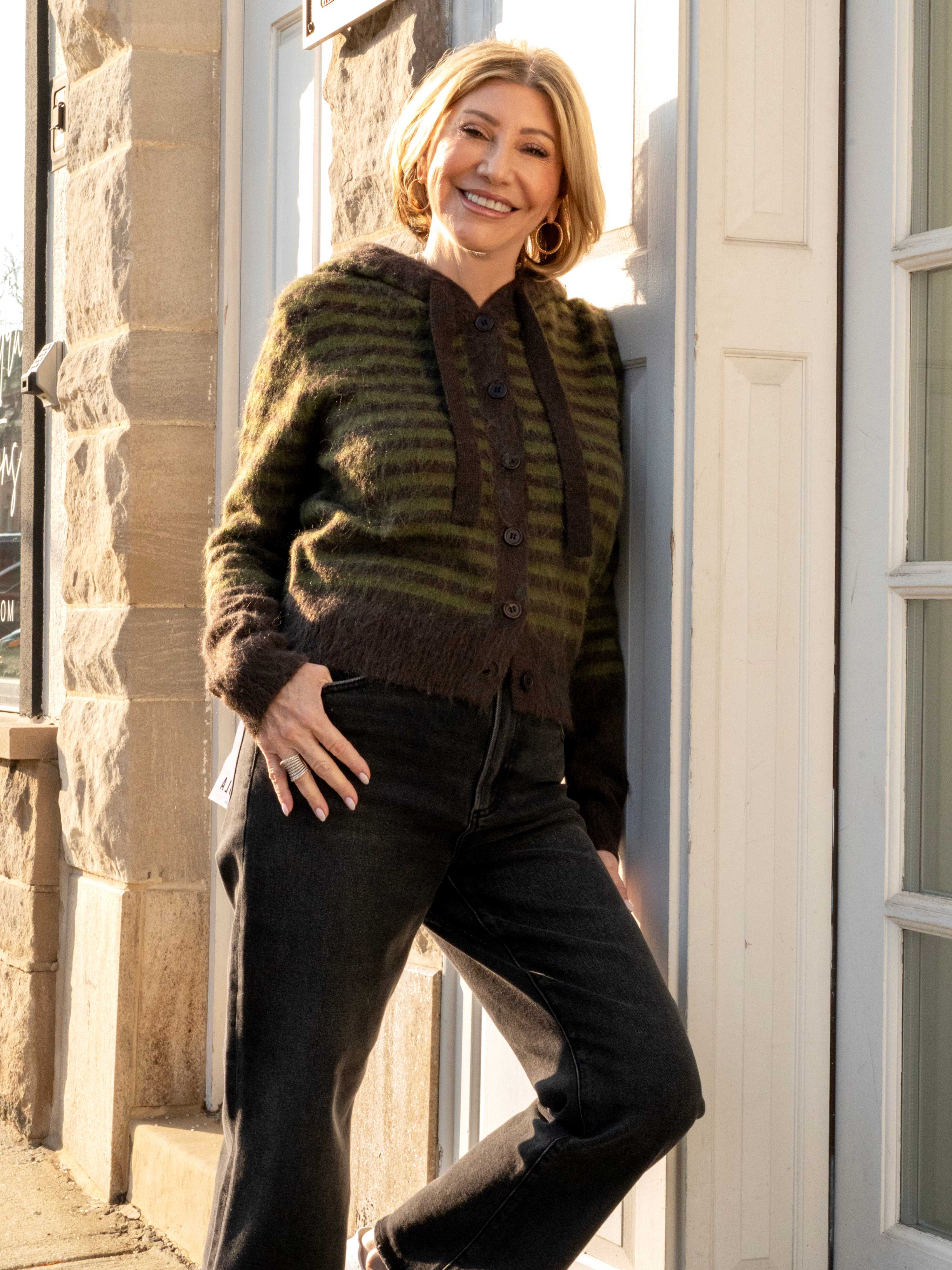 • Looking your cutest and coziest self is easy in this striped hoodie sweater cardigan! Soft and fuzzy striped knit shapes this relaxed bodice with a functional button down placket and hoodie with drawstrings. Long sleeves end in ribbed cuffs.