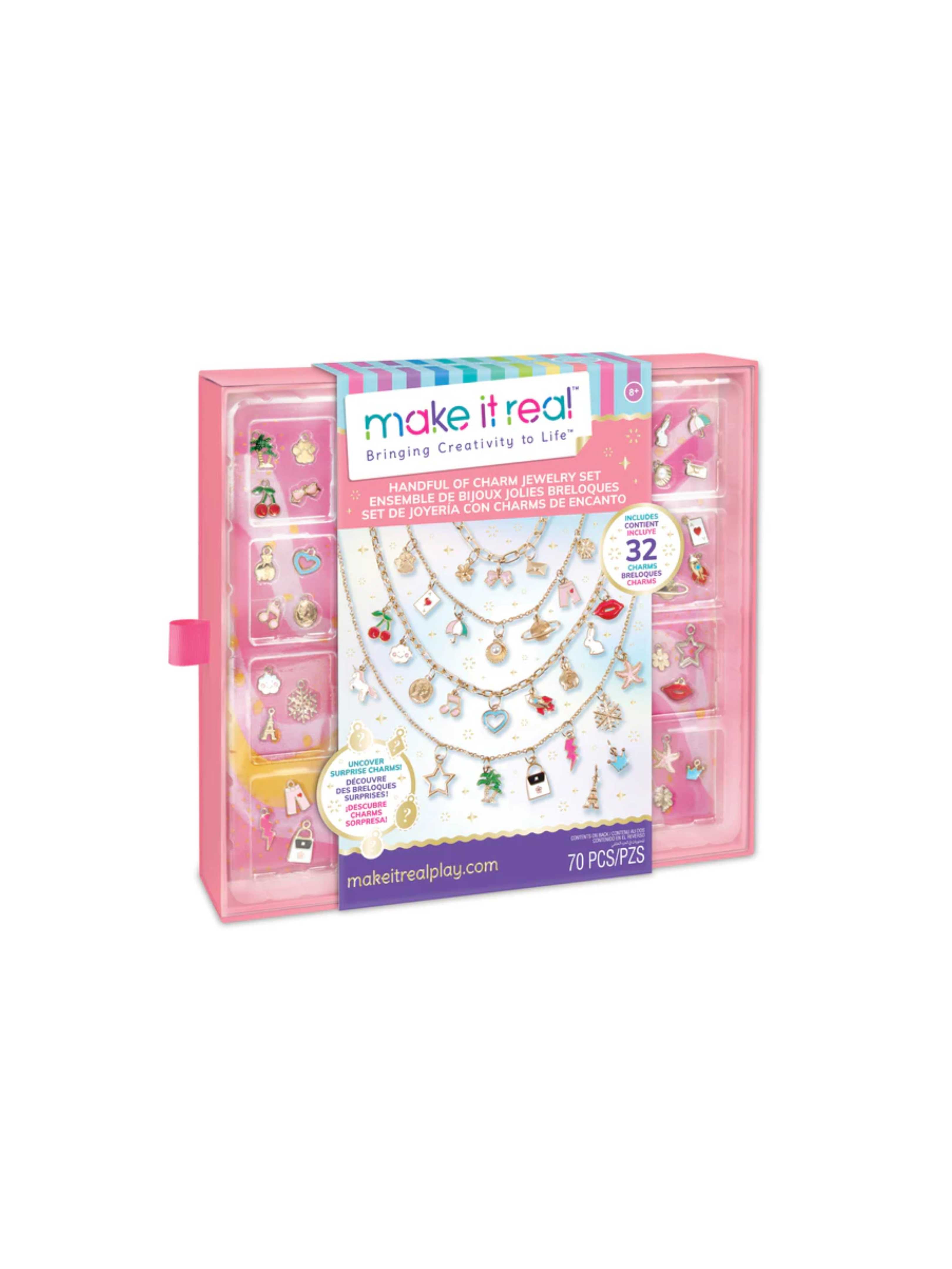 Start by choosing the chain, then organize the charms with the included charm mat to style your necklace. Bling out each accessory with a chic collection of 32 charms, including 4 surprise charms!