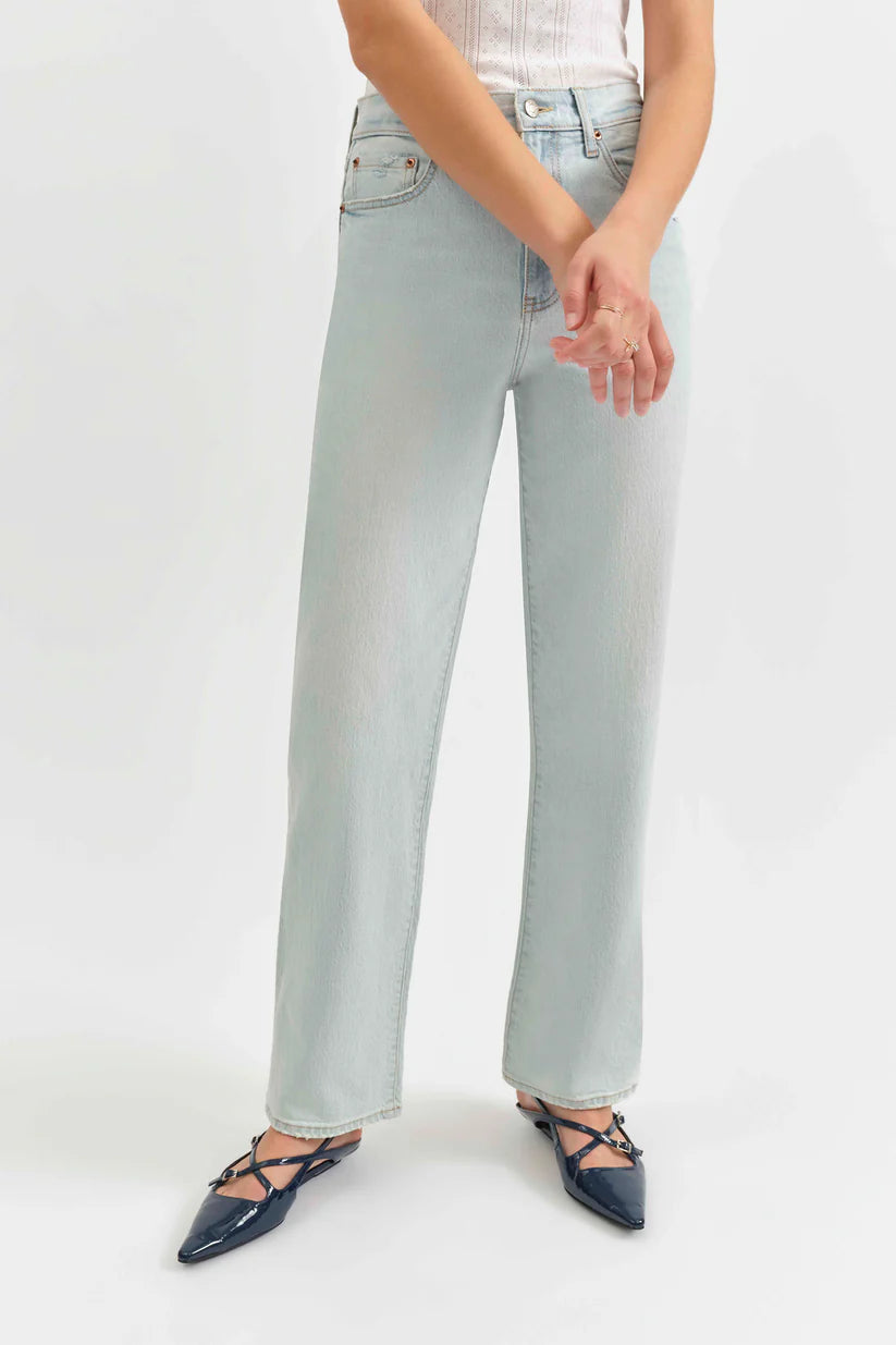 The Sundaze in Lost Love is a vintage-inspired high rise straight leg in a light blue wash. This vintage-inspired jean is constructed from our Tough Love fabric, which is mostly rigid but yields to your body in all the right ways.