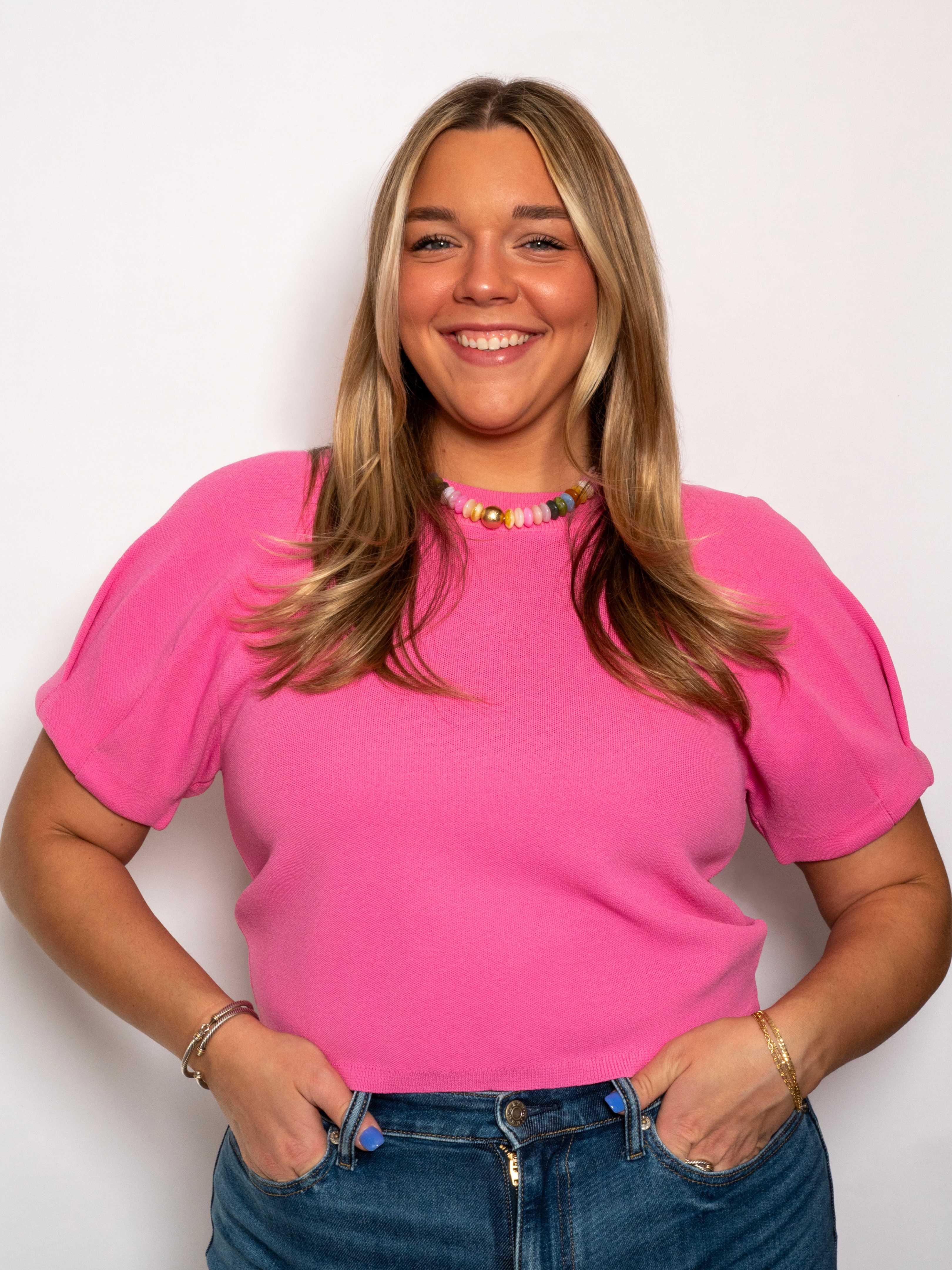 • Solid short puff sleeve knit top featuring crew neckline. Shaped sleeve seam detail.