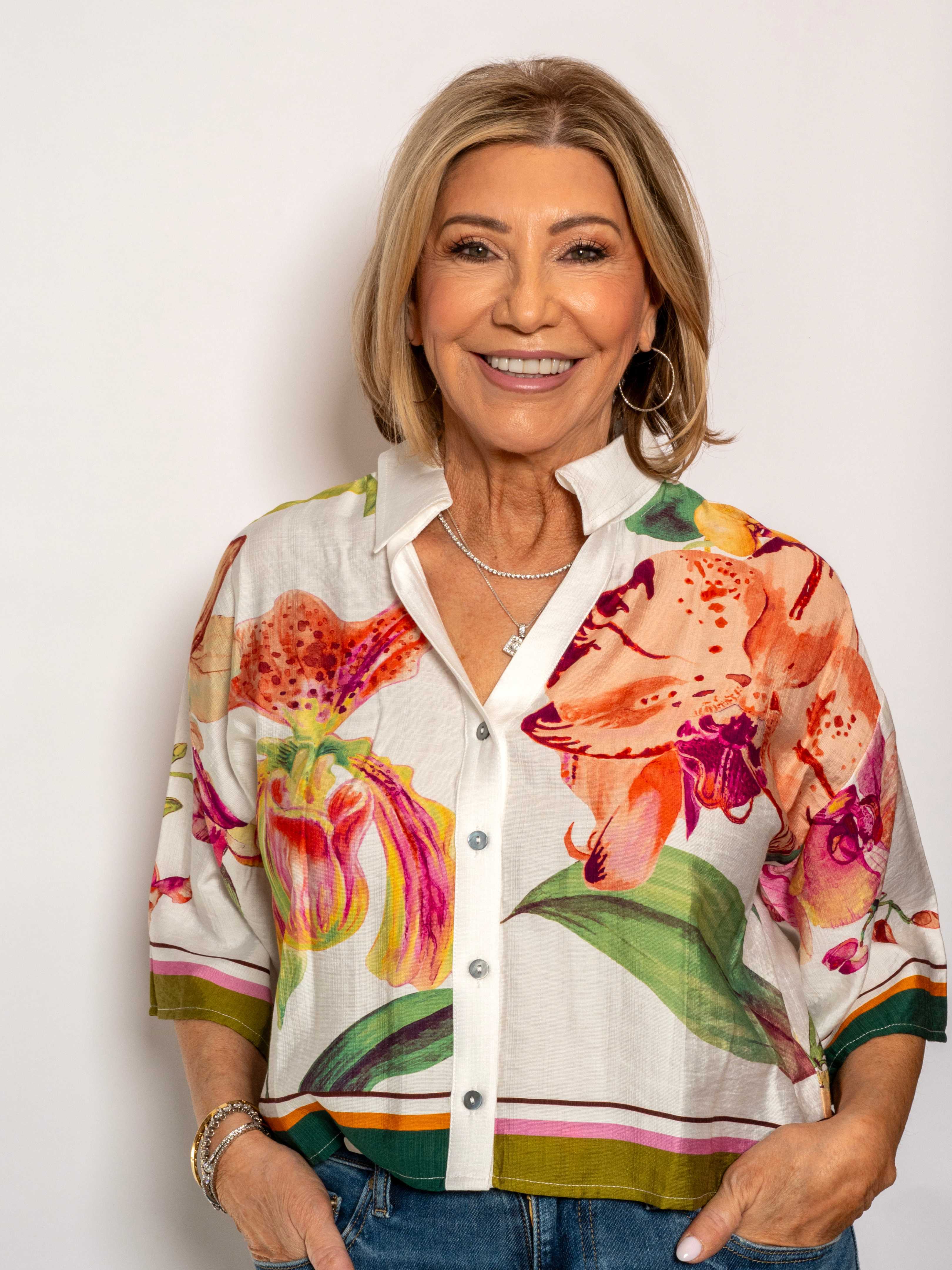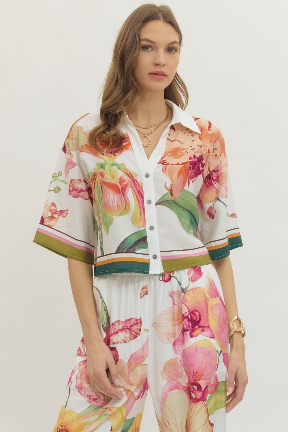 • Printed short sleeve top featuring contrast border trim at hem and sleeve cuffs.