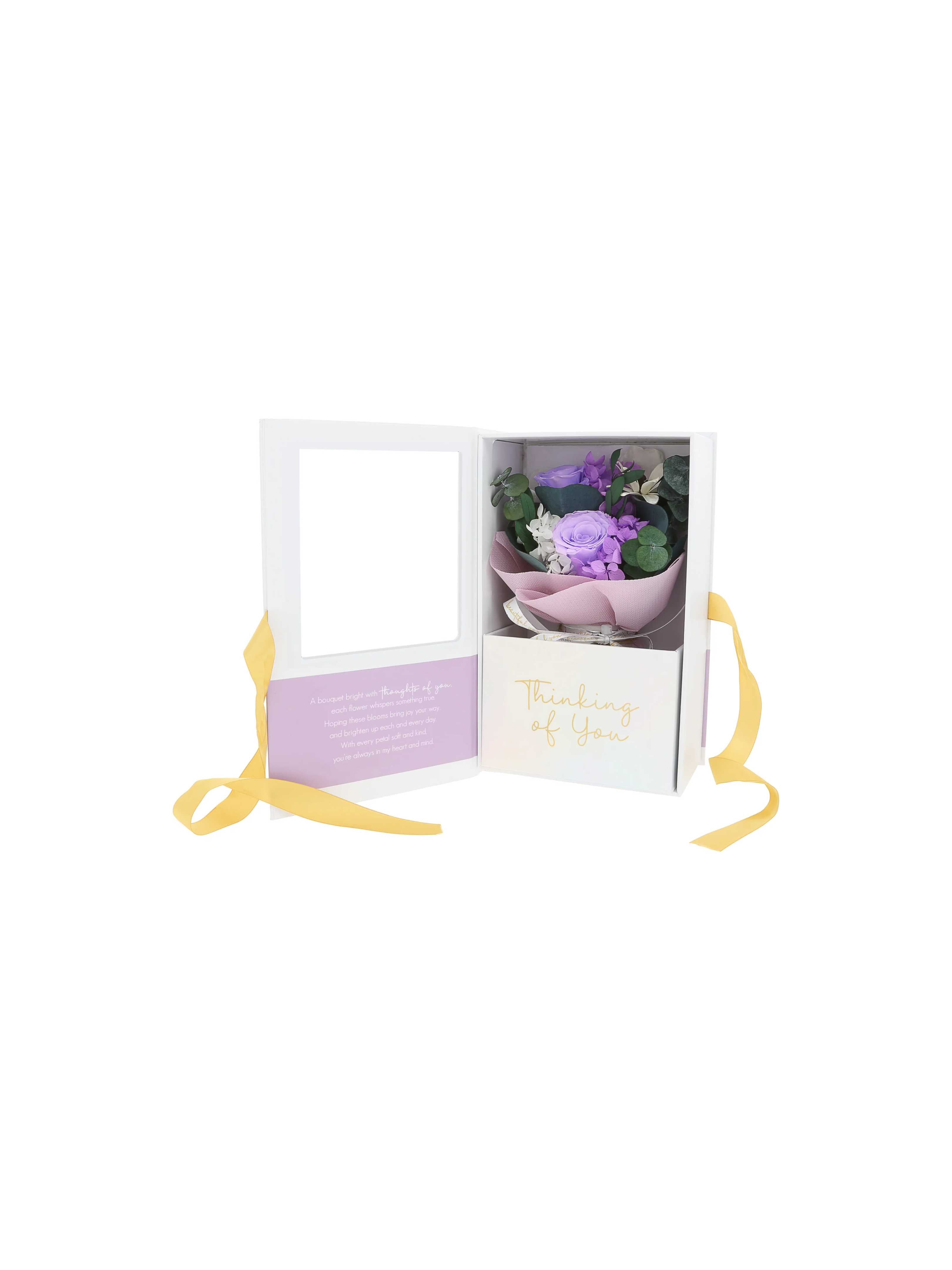 This preserved floral arrangement is crafted from dried flowers to ensure long-lasting beauty. The flowers are wrapped in paper and tied with a delicate ribbon with the phrase "Thinking of You." The inside sentiment reads, "Hoping these flowers bring light and love to your view. Each petal a memory, each flower a bright hue~sending positive thoughts your way to lift your spirits and brighten your day. Today and always thinking of you!". Housed in a gift box with gold accents, this arrangement measures 5.75" x 9.25" x 3.25", offering a high-end presentation that makes it perfect for gifting.