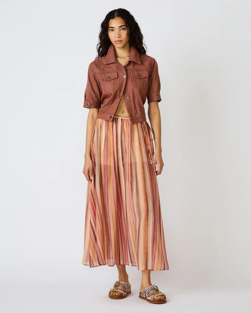 Combines effortless elegance with contemporary flair. This maxi skirt features a graceful, flowing silhouette enhanced by vibrant multi-colored stripes that add visual interest and movement. The relaxed drape creates a flattering, comfortable fit perfect for both casual outings and elevated occasions.