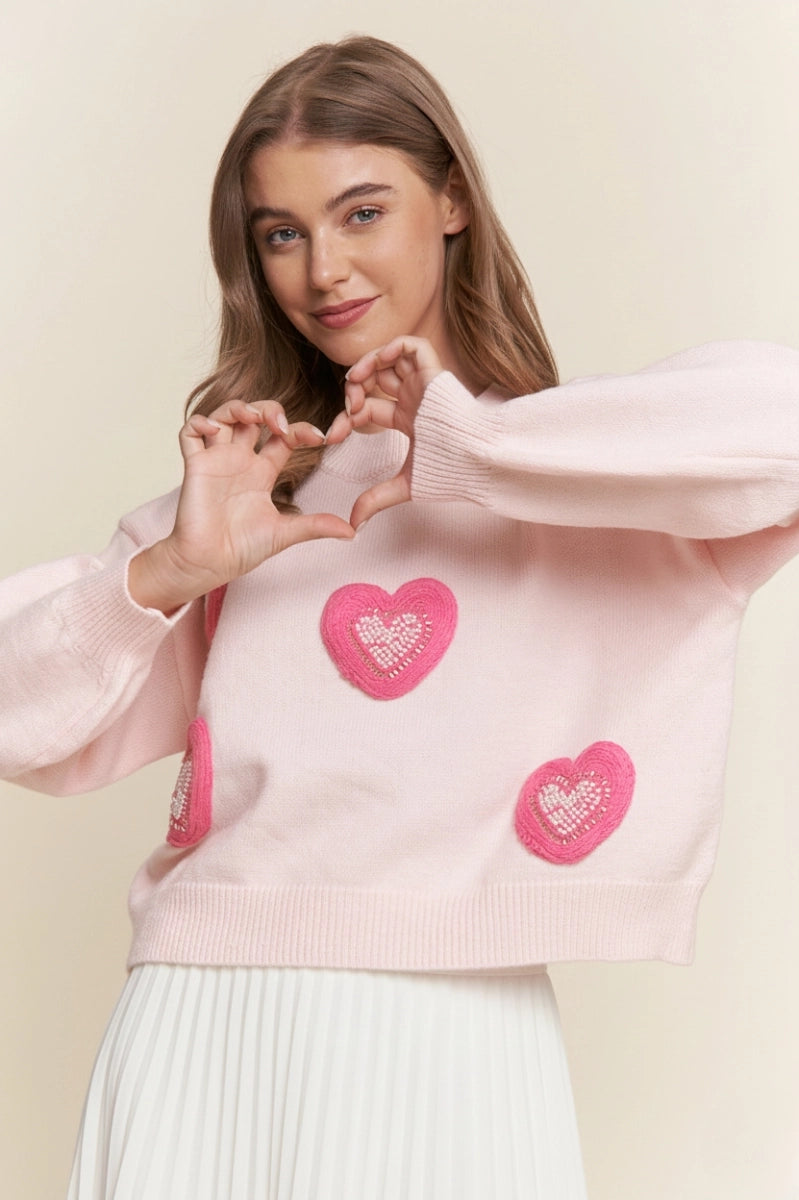 Women's heart embroidered & pearl accent long sleeve soft knot sweater top.