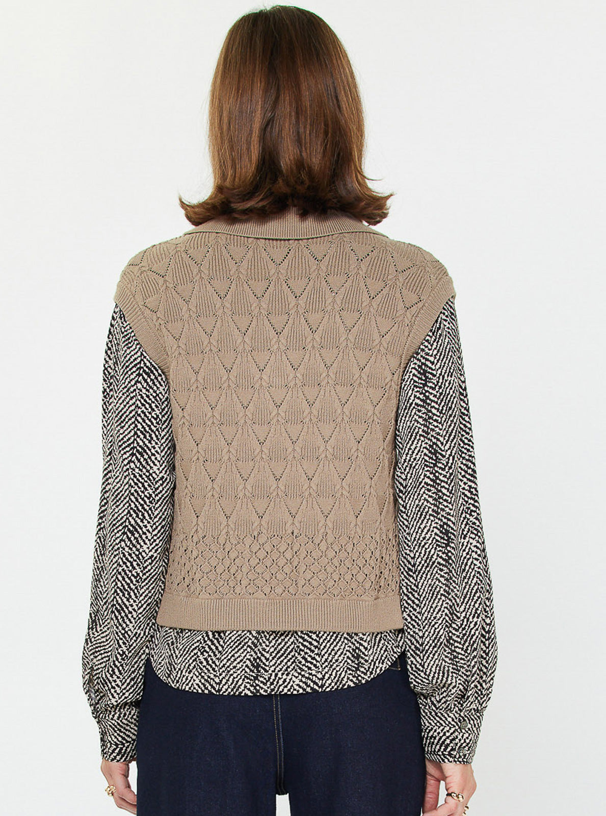 -Mixed sweater and woven combo -Spread collar with button placket -Textured knit front and back