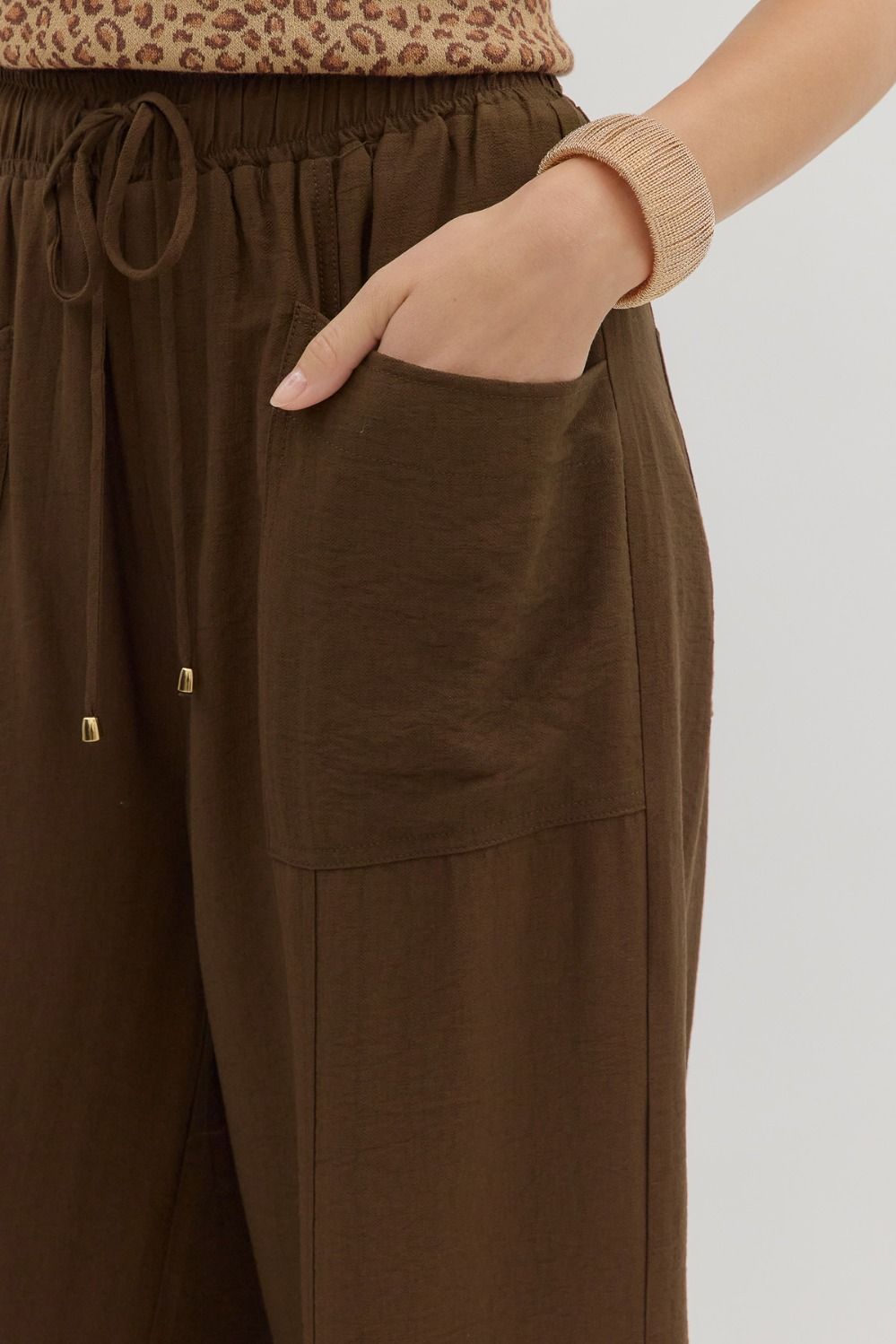 Solid high-waist pull-on wide-leg pants featuring asymmetrical pocket detailing at front and patch pockets at back