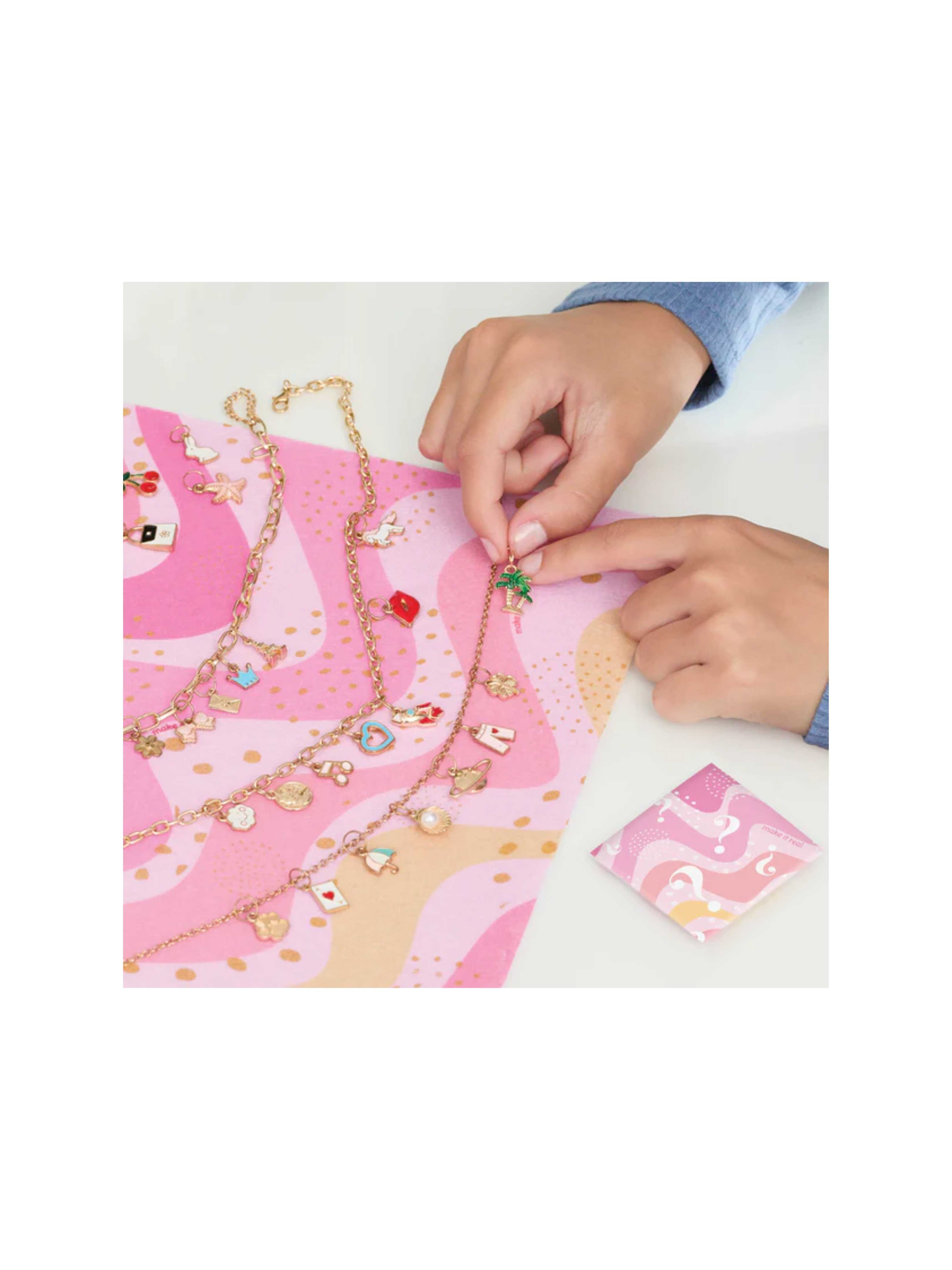 Start by choosing the chain, then organize the charms with the included charm mat to style your necklace. Bling out each accessory with a chic collection of 32 charms, including 4 surprise charms!