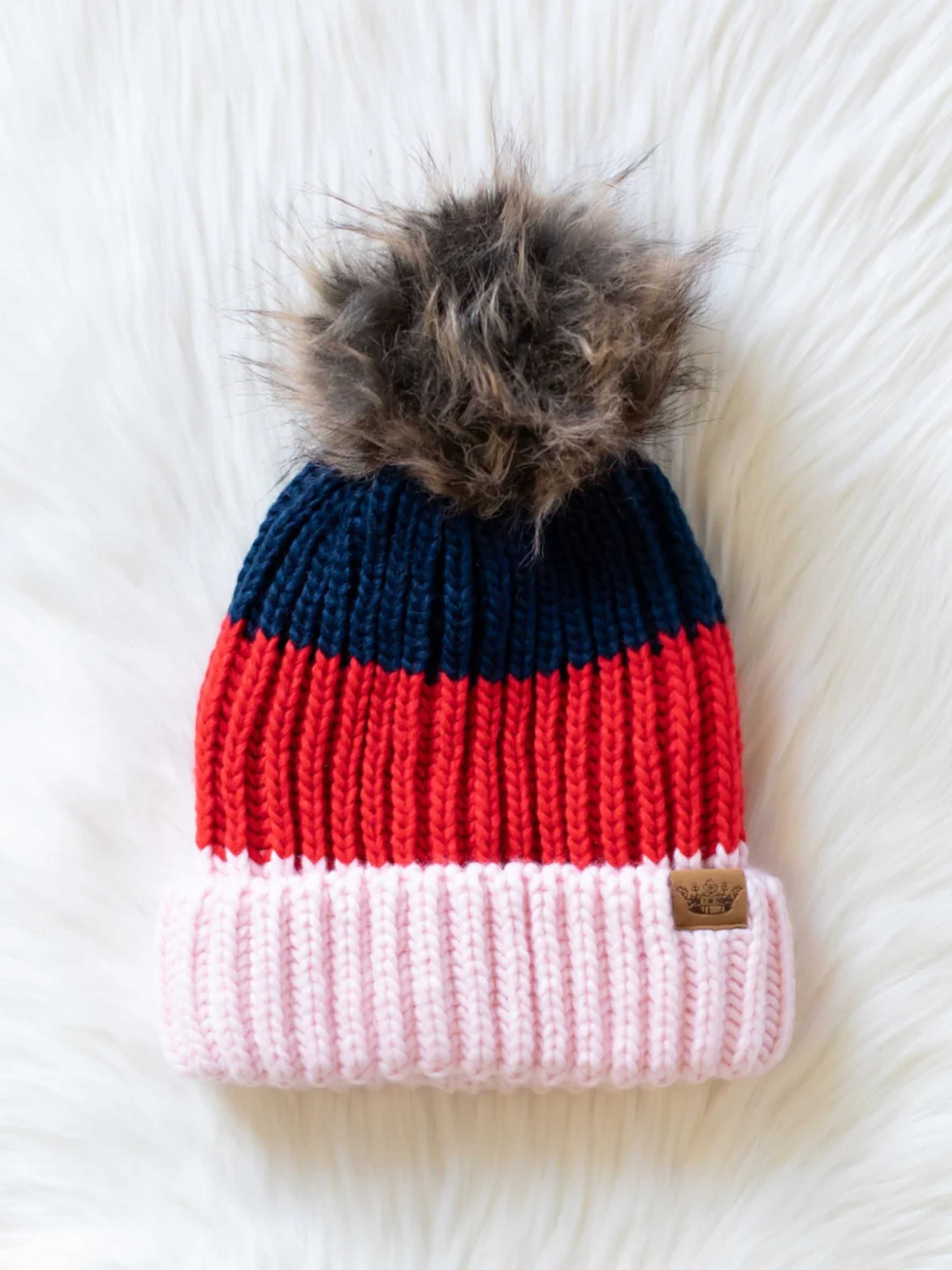 • Light Pink, Red and Navy Ribbed Knit Color Block Pom Hat