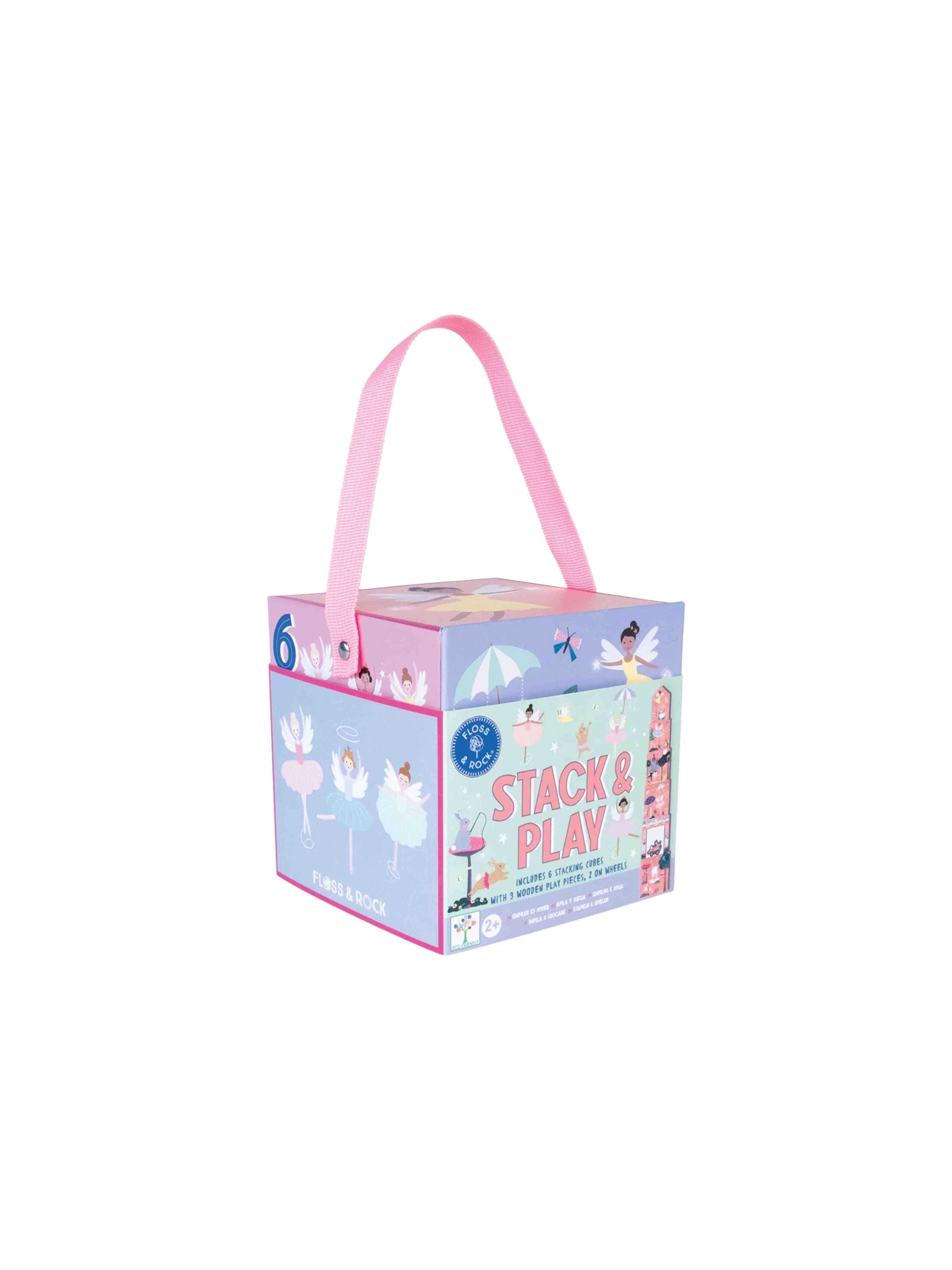 The lovely Enchanted design features ballet dancers, friendly forest animals and many more. Stack & Play includes 6 stacking cubes, 3 wooden play pieces, 2 on wheels. All parts are stored in the biggest box with a handy carry handle, making it so easy to take around with you!