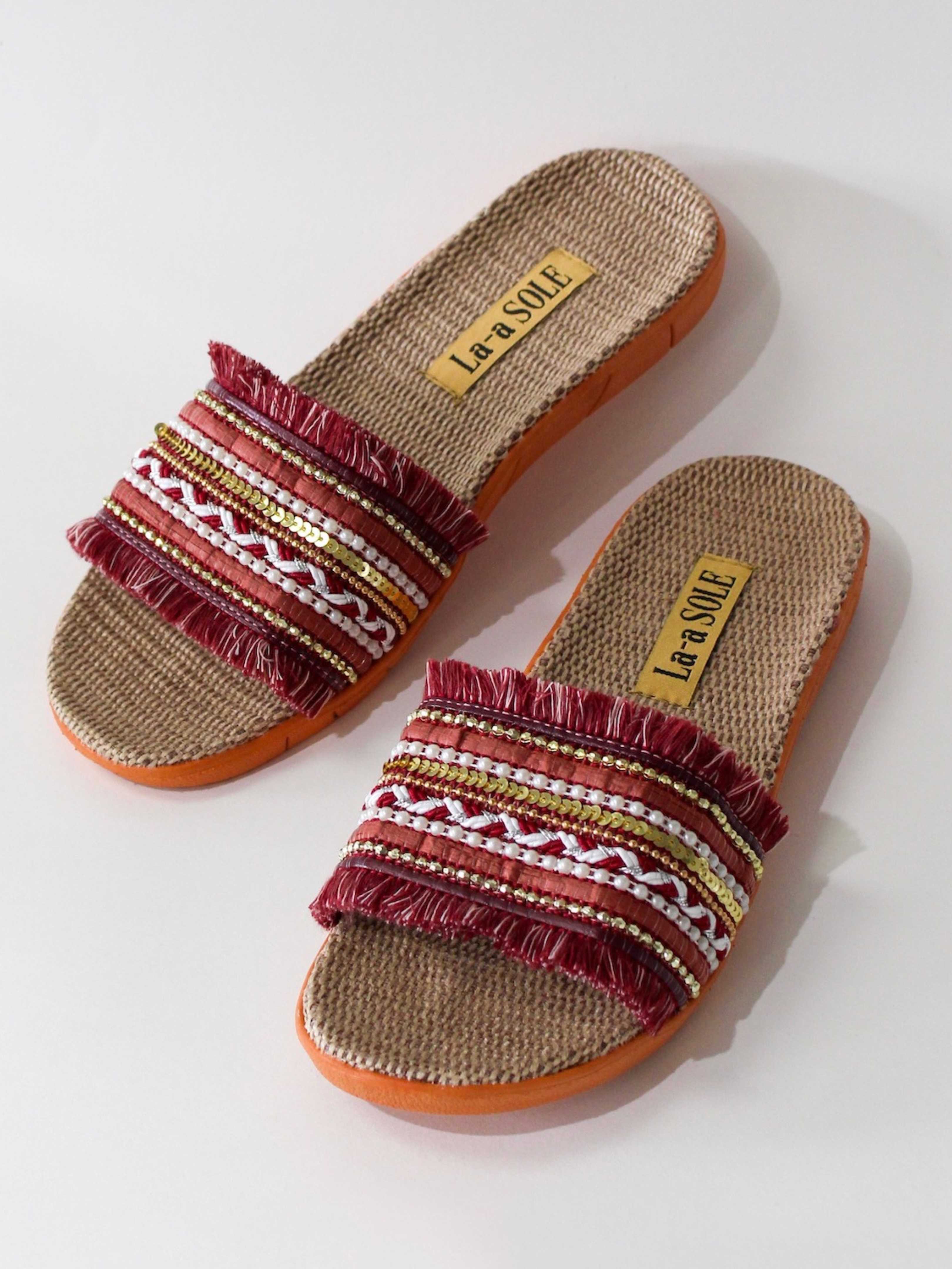 - Style and comfort go hand in hand with our Boho slides. Boho fringe and beaded detailing across the band. This easy to slip-on style is perfect for the beach and looks great with just about anything!