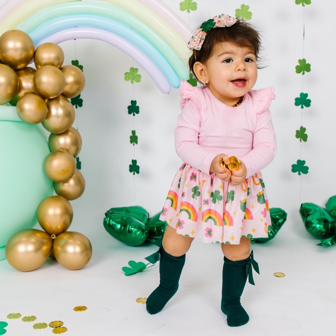 * Bodysuit Color: Soft Pink * Tutu Color: Soft pink tulle printed with a lucky doodle pattern * Material: 95% Cotton/5% Spandex * Features: Snap closure at back and bottom for easy dressing; elastic empire waist for extra comfort